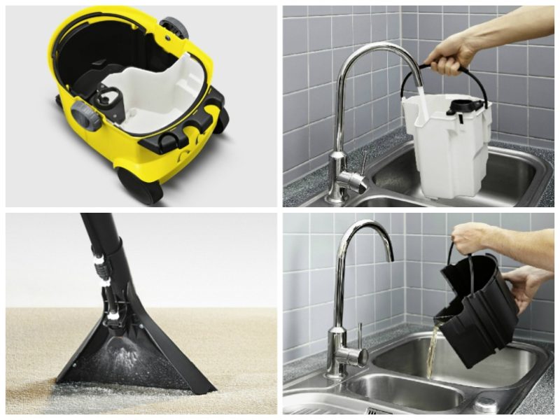 L'acqua viene aspirata dal serbatoio dell'acqua pulita e spruzzata sulla superficie usando un ugello. La spruzzatura del liquido viene effettuata attraverso un tubo speciale situato sull'impugnatura e alla base dell'ugello. Successivamente, inizia la modalità di aspirazione dell'acqua spruzzata, insieme allo sporco attraverso un ugello stretto e tale acqua entra in un serbatoio speciale.