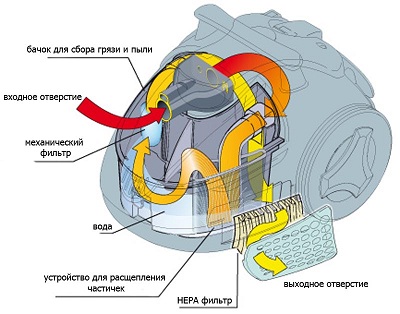 La purificazione dell'aria efficace e di alta qualità da particelle microscopiche, sottili, di polvere, detriti e vari microbi fornisce filtro del tipo di acqua. Un tale filtro per l'acqua funziona secondo il principio di sopprimere lo sporco e la polvere con l'acqua. Questo design di un aspirapolvere dotato di un filtro per l'acqua è simile a un aspirapolvere con un tipo di pulizia a ciclone, ma la differenza è che la polvere viene raccolta in un flusso di vortice d'acqua anziché in aria.