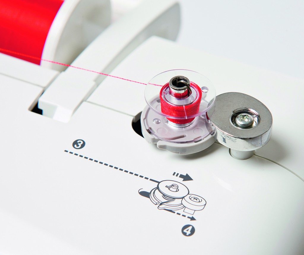 - Iniziando a cucire articoli tessili, dalla bobina selezionata è necessario avvolgere leggermente la bobina del filo.