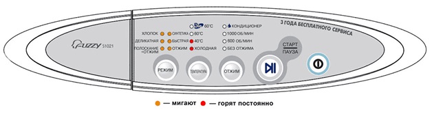 Le unità Samsung che non dispongono di uno schermo ti avviseranno di un malfunzionamento con l'aiuto di una caratteristica illuminazione a LED: i LED della funzione di lavaggio lampeggiano e i LED (primo e secondo, conto alla rovescia dal basso verso l'alto) si accendono a 30 ° С e 40 ° С