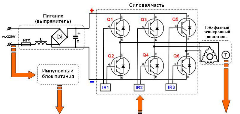 Intero lavoro motore della lavatrice controllato da una combinazione di apertura, chiusura e sblocco parziale delle chiavi di accensione raccolte sui transistor. Cambiano la direzione del flusso di corrente sulle fasi delle bobine e l'entità del flusso magnetico al loro interno. L'inverter controlla il funzionamento dei tasti mediante la modulazione della larghezza di impulso.