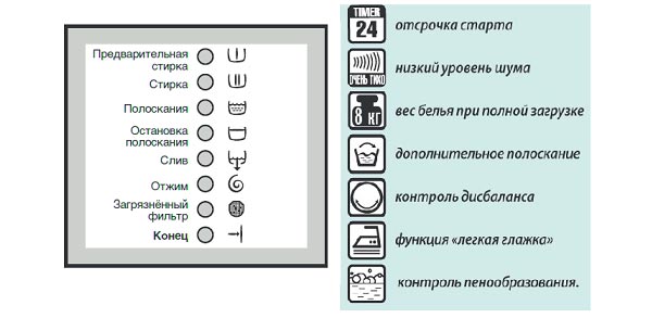 Numerosi badge adornano il pannello della lavatrice. Quali informazioni ci sono da cercare? Per cominciare, tutti gli elementi sono suddivisi condizionatamente in blocchi. Quindi è molto più facile lavorarci: