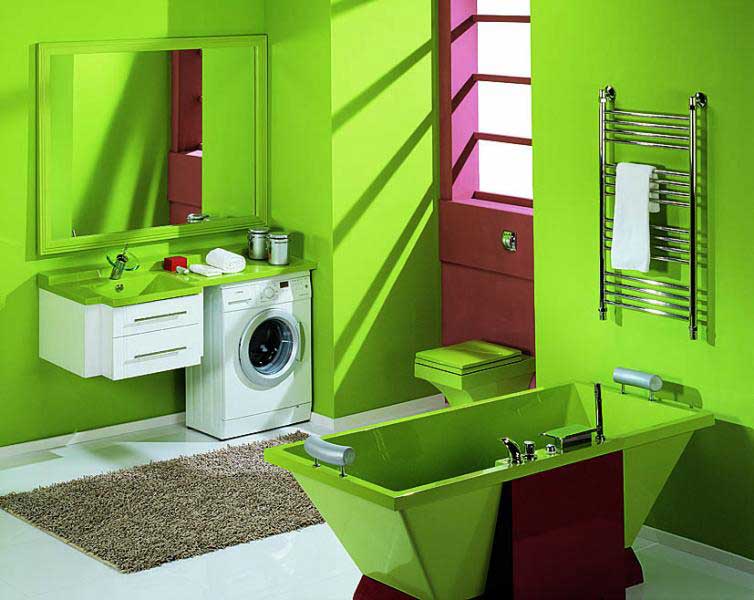 Foto: progettazione di un bagno con lavatrice. In questo caso, l'enfasi non è solo sul posizionamento delle attrezzature, ma anche sulla combinazione di colori di pareti e articoli per la casa.