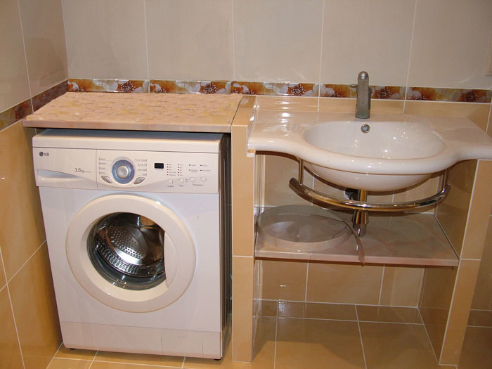 La posizione dell'elettrodomestico sotto il piano di lavoro sembra più accettabile. Se viene utilizzato un piano di lavoro per installare il lavandino, la lavatrice sarà idealmente sotto di essa.Anche se, in questo caso, sarà necessaria una ricostruzione del sistema di approvvigionamento idrico.
