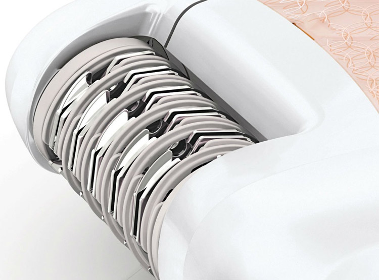 Il principio di funzionamento e il design di un epilatore a disco sono simili alle pinzette, con l'unica differenza che al posto delle singole piastre, i dischi ondulati vengono catturati ed estesi dai capelli sulle gambe e su altre parti del corpo. Mentre ruotano attorno al proprio asse, i dischi in determinati punti vengono a contatto tra loro, il che garantisce una presa affidabile dell'asta. Tutti i vantaggi e gli svantaggi dell'utilizzo di un tale epilatore sono simili alle pinzette, così come le controindicazioni alla procedura, le cui principali includono: