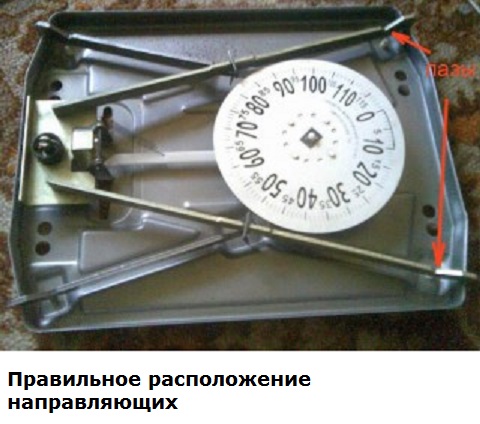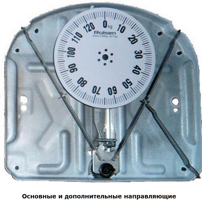 Innanzitutto è necessario verificare la posizione corretta delle quattro rotaie, verificare quanto le loro scanalature si adattano correttamente alle rientranze corrispondenti situate agli angoli della custodia. Solo dopo è necessario inclinarli e ispezionare la connessione con la molla principale. Un motivo comune per la rottura delle bilance da pavimento meccaniche è lo slittamento di due binari aggiuntivi collegati a quelli principali. Tale danno si verifica a causa di urti o cadute. È sufficiente posizionare le guide e il dispositivo funzionerà.