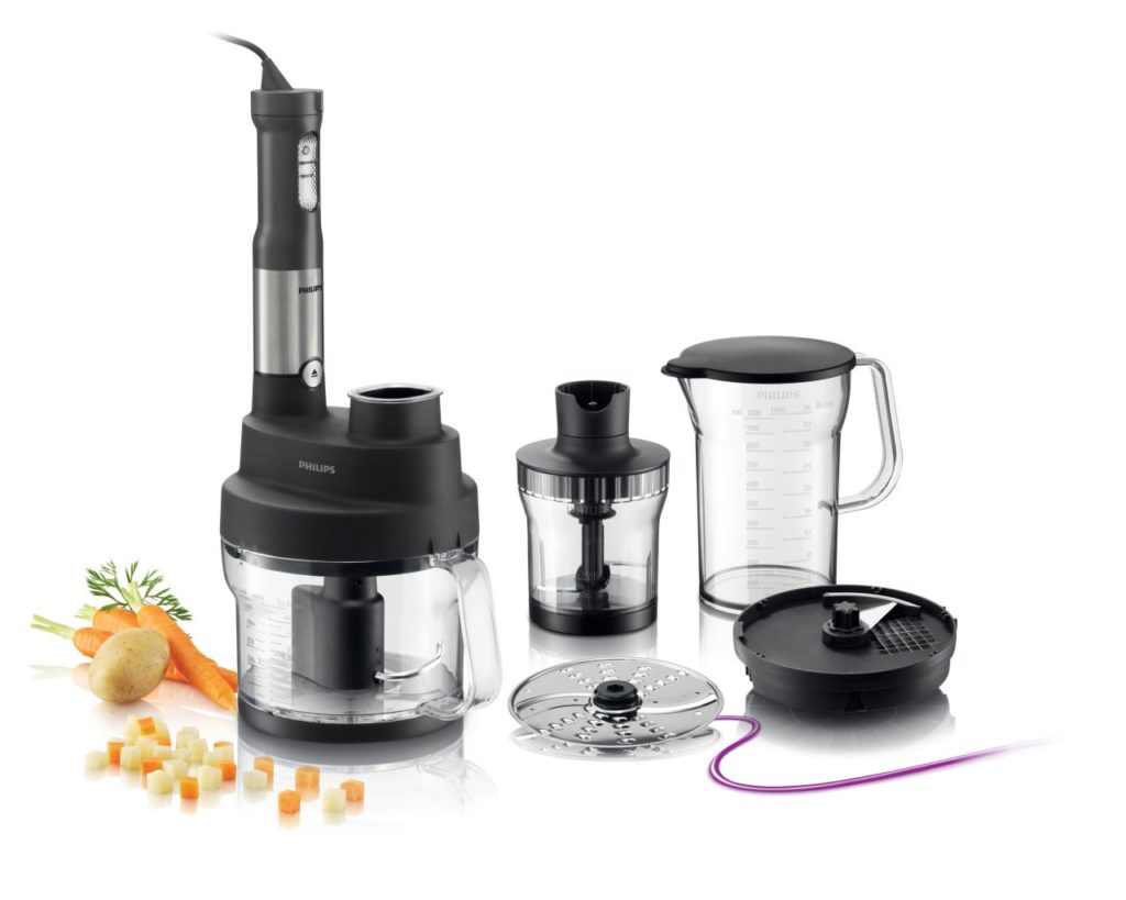L'opzione budget include un modello Philips HR 1659 con una potenza di 600 watt. Modalità di commutazione - 15, peso - 3 kg, il kit include un bicchiere con un volume di 600 ml con una designazione dimensionale. La parte sommergibile è in acciaio inossidabile. Prezzo - da 6000 rubli. La tecnica macina facilmente verdure dure e crude.