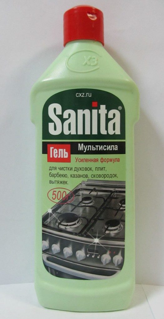 - Sanita - detergente per gel per la pulizia del gel. Per l'applicazione, puoi usare qualsiasi dispositivo improvvisato, ma allo stesso tempo, tutto il lavoro deve essere fatto solo con i guanti. Il tempo di esposizione per la ripartizione dei grassi è di 20 minuti. A causa dell'addolcimento dei contaminanti grassi durante il processo di esposizione, scendono gradualmente lungo le pareti. Dopo l'esposizione per il tempo specificato, la superficie del forno deve essere lavata accuratamente.