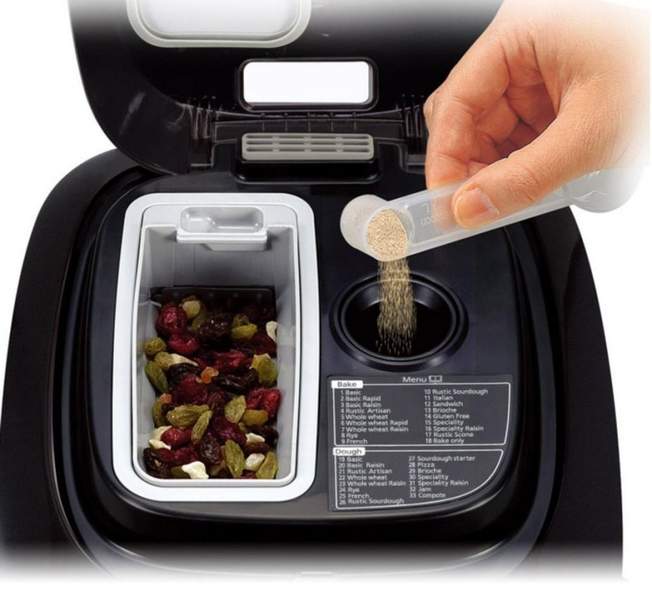 - gli ingredienti devono essere preparati prima di metterli nel distributore: asciugare l'uvetta e arrotolare la farina, cospargere la frutta candita con lo zucchero a velo in modo che non si attacchino, ecc. Altrimenti, potrebbero rimanere uniti e non cadere nell'impasto;