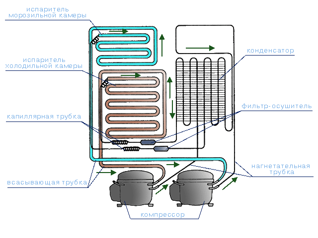 Il refrigerante circola nel sistema di tubi: freon o isobutano. Il freddo non si verifica da solo, è solo il risultato della rimozione del calore dall'interno del frigorifero. Il principio di funzionamento si basa sul lavoro ciclico: il motore avvia il pistone, che pompa la pressione, il freon compresso dall'evaporatore viene distillato attraverso il sistema. Passando attraverso i tubi del condensatore, il refrigerante si libera del calore ricevuto, si raffredda e diventa liquido. Attraverso l'essiccante attraverso i capillari, il freon si sposta nell'evaporatore. Tale ciclo dura fino a quando la temperatura nel frigorifero raggiunge il valore impostato. Quindi il relè di avvio spegne il motore.