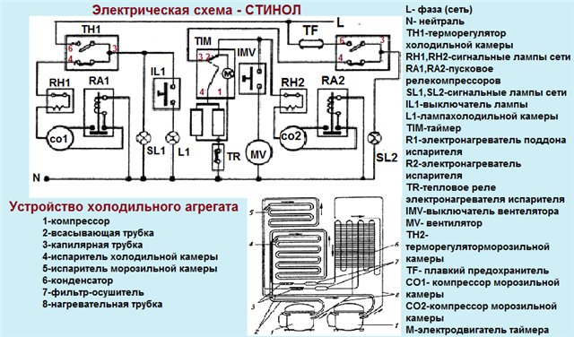La temperatura impostata con la manopola di controllo della temperatura o i pulsanti di controllo elettronico è controllata da un relè termico. Fornisce un segnale al compressore e si accende o si arresta. Se viene generato freddo, viene erogata la potenza nominale, i contatti del relè vengono chiusi, la corrente elettrica scorre attraverso il circuito. Quando viene raggiunta la temperatura specificata all'interno della camera, i contatti del relè termico si aprono, il motore del compressore si spegne. La figura mostra lo schema elettrico di un frigorifero a due camere.