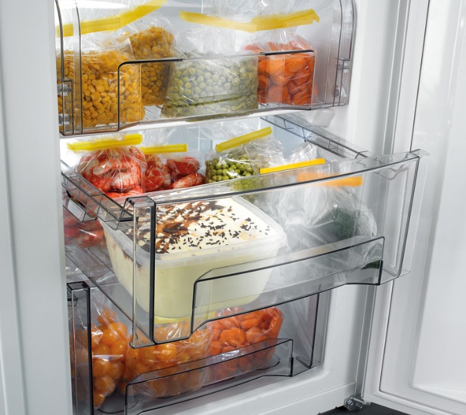 - La posizione delle telecamere. Un congelatore inferiore è preferibile a uno superiore, poiché lo scomparto frigorifero viene utilizzato più spesso. È conveniente estrarre e posare i prodotti senza inclinarli. Se la sezione a bassa temperatura è alla base, è più facile stendere i cassetti.