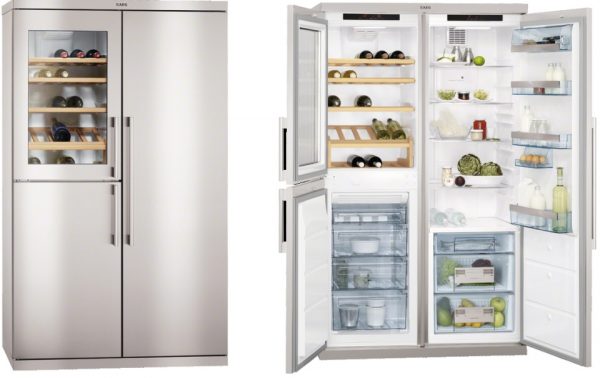 - Dispositivi affiancati. I grandi dispositivi assomigliano a un piccolo appartamento. Hanno due porte che si aprono l'una verso l'altra, una per il congelatore e l'altra per il vano frigorifero. La larghezza arriva a 120 cm, la profondità è di 60-80 cm, l'altezza è di 170-210 cm e consente a una famiglia numerosa di non limitarsi in un luogo dove conservare prodotti freschi e refrigerati.