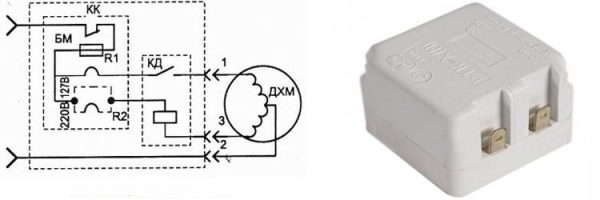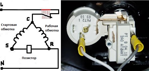 Nei moderni frigoriferi domestici, viene utilizzato un relè di avviamento con un posistor integrato (un resistore che aumenta la resistenza all'aumentare della temperatura). Il circuito di questo dispositivo (Fig. 2) è simile a un relè a induzione, ma invece di una bobina, una resistenza collegata al circuito di partenza viene utilizzata per chiudere e aprire il contatto di partenza.