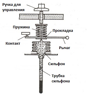 Con un aumento della temperatura, la pressione del soffietto sulla molla aumenta, la leva funziona, il contatto si chiude. Quando la temperatura diminuisce, tutto accade al contrario. La modalità di apertura dei contatti dipende dalla forza della molla, che è regolata dalla manopola di controllo.