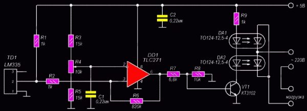 Il termoregolatore in questo circuito è il sensore di temperatura LM335. Il dispositivo è un diodo zener sensibile alle variazioni di temperatura. Il clima nel vano frigorifero è regolato da una resistenza variabile R4. All'aumentare della temperatura dell'aria, all'uscita del comparatore TLC271 appare un segnale, che apre il transistor KT3102, che avvia il frigorifero. Di conseguenza, quando la temperatura diminuisce, all'uscita del comparatore appare zero, il compressore si spegne.