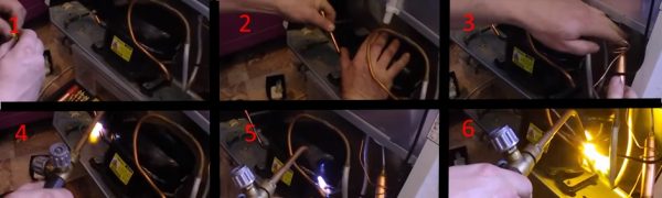 - A una distanza di 1-2 cm dalla giuntura del tubo-compressore, tagliare i tubi di aspirazione e di scarico, fare lo stesso a una distanza di 1–1,5 cm dalla giuntura del filtro del condensatore con un essiccante. Per fare ciò, utilizzare un tagliatubi.