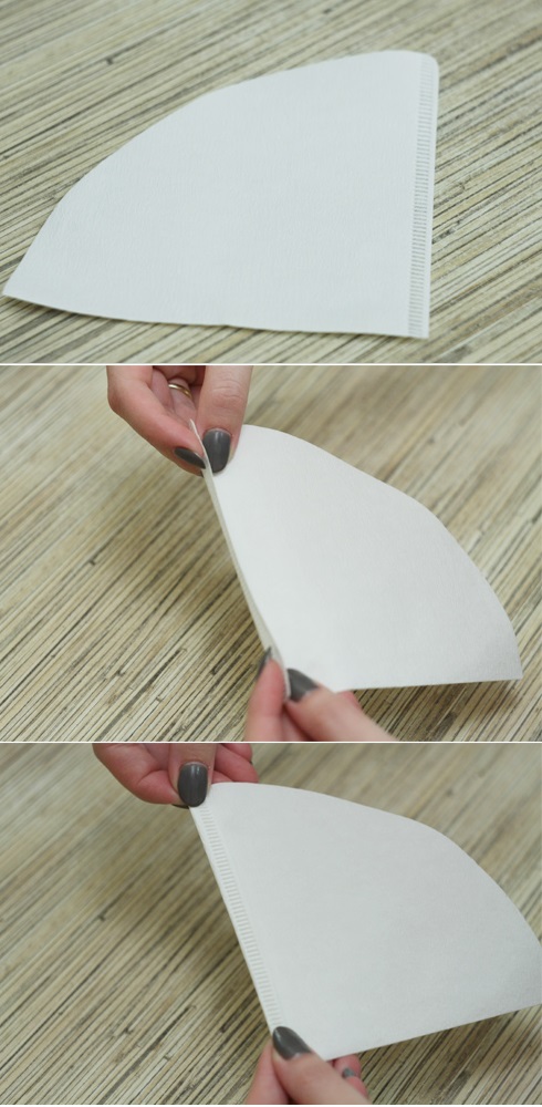 Importante: prima di procedere, è necessario verificare la qualità della carta quando esposta all'acqua. Materiale troppo denso aumenterà il tempo di filtrazione e la cellulosa sfusa di scarsa qualità, quando viene a contatto con acqua bollente, “crepa” e il caffè non funzionerà.
