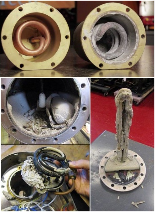 - depositi di calcare si formano attorno all'elemento riscaldante sotto forma di un accoppiamento, che alla fine porta ad una diminuzione del trasferimento di calore;
