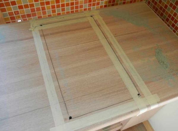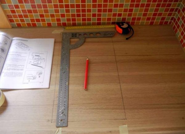 - Sulla superficie del piano di lavoro, vengono applicati i bordi dello spazio interno dell'armadio, su cui verrà posizionato il piano di cottura. Pertanto, verrà indicato il luogo in cui verrà eseguito il lavoro. I segni dovrebbero essere applicati con una matita, in modo che alla fine del lavoro le linee possano essere facilmente cancellate. Se il piano di lavoro non consente di tracciare linee chiaramente visibili, è necessario incollare il nastro adesivo di carta sulla sua superficie e su di esso dovrebbe essere già tracciato un markup.