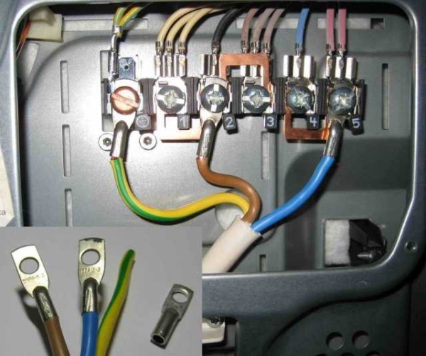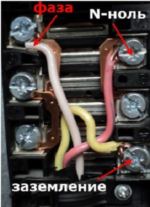 - la fase è fissata al terminale L, le sue vene sono rosse. Il neutro di colore nero è attaccato al terminale contrassegnato dalla lettera N. E la messa a terra deve essere collegata agli elementi con la lettera E. La messa a terra viene eseguita utilizzando cambric con colore giallo-verde, deve essere fissata ai fili;