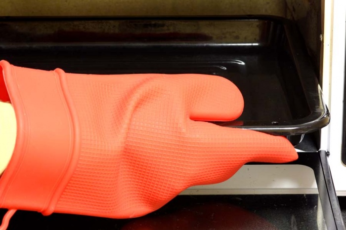 Guanti da forno in silicone per rimuovere i piatti da una stufa a gas