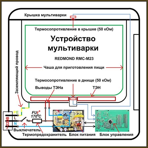 Nei moderni multicucina ci sono 2 microcircuiti. Il primo si trova al centro del dispositivo all'interno del cilindro di lavoro ed è responsabile del controllo del regime di temperatura. Il secondo si trova nella parte inferiore del multicucina ed è una scheda elettronica di potenza.