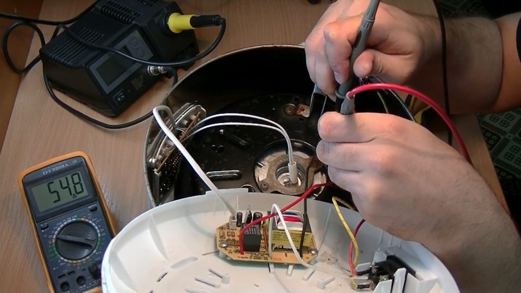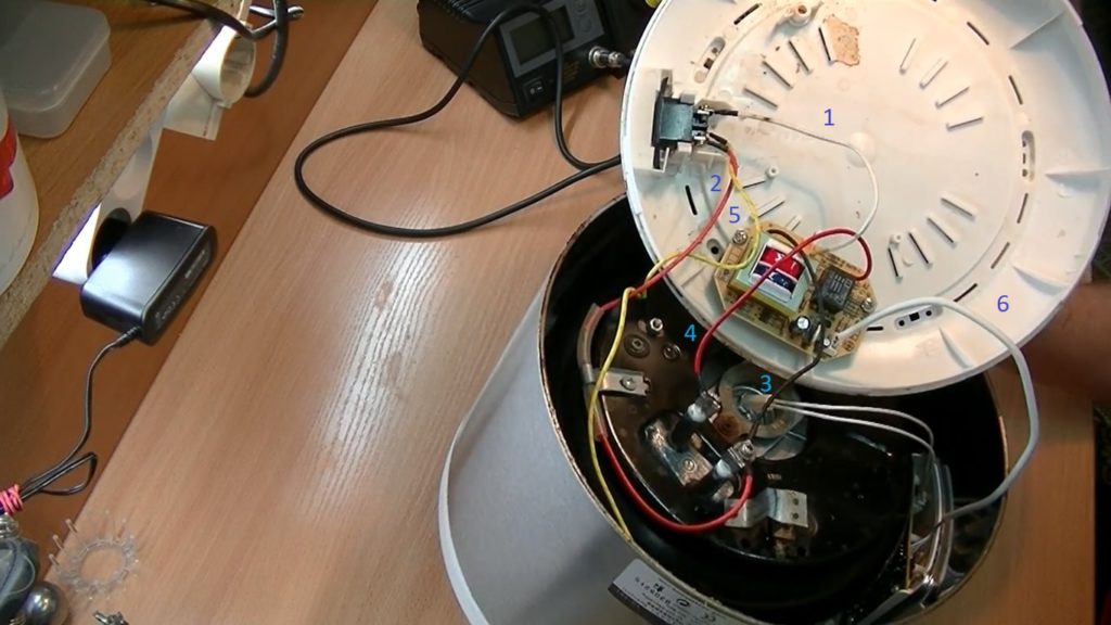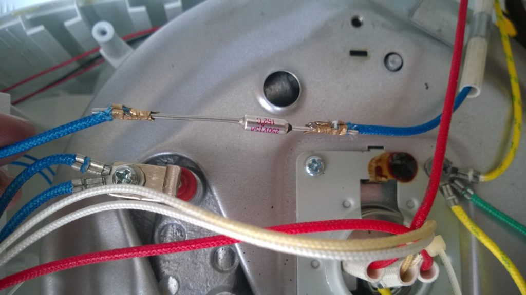 Dopo aver smontato il dispositivo, è possibile vedere diversi fili all'interno, è necessario trovare quello che va dalla presa di corrente al terminale dell'elemento riscaldante. Il filo passerà attraverso il fusibile termico, che si trova nel tubo di plastica dell'isolamento termico.