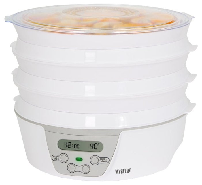 - Mystery MDH-325. Un'opzione economica. Dispositivo convettivo con un elemento riscaldante situato sotto. Dotato di pallet per un importo di 6 pezzi. La parte superiore dell'asciugatrice è trasparente. Controllo elettronico installato con indicazione di potenza e schermo LCD. È possibile impostare i seguenti parametri: temperatura (32-74 gradi), tempo di funzionamento (30 minuti - 48 ore). La potenza dell'asciugatrice è di 500 watt.In presenza di una funzione aggiuntiva: protezione dal surriscaldamento. Il produttore del dispositivo è la Cina. Basso costo - 2730 rubli.