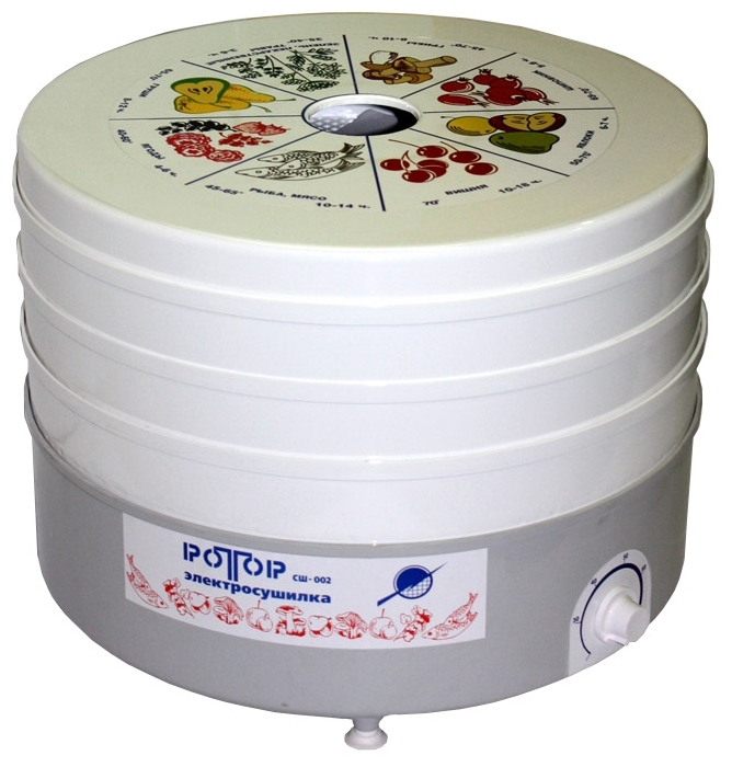 - Rotore SSH-002. Elettrodomestico convettivo progettato per asciugare pesce e carne, asciugare prodotti da giardino. Il dispositivo è realizzato in buona plastica resistente al calore, ha 5 vassoi. La temperatura è regolata da un interruttore manuale nell'intervallo di 30-70 gradi, potenza - 520 watt. Produttore - Russia, prezzo accessibile - circa 2300 rubli.