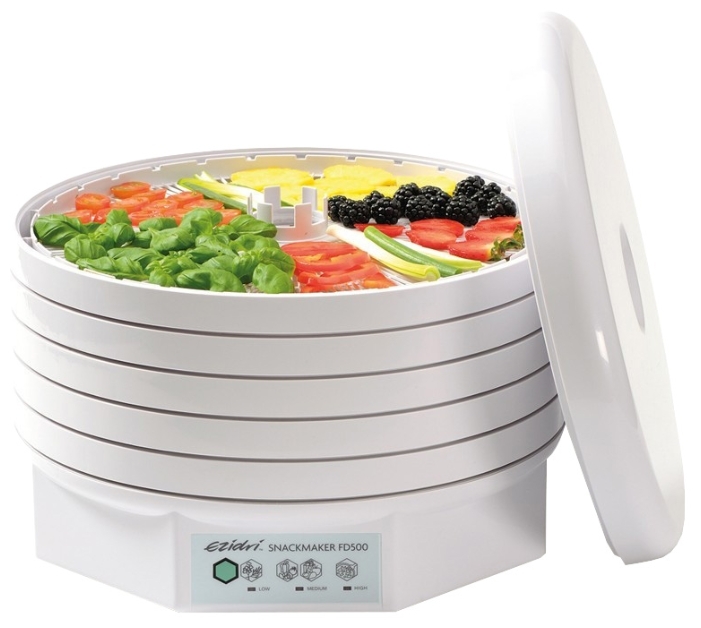- Ezidri Ultra FD 1000. La custodia è in plastica per alimenti, non si scioglie ed è completamente innocua, all'interno sono collocati fino a 30 pallet. L'aria viene fornita in modo uniforme, quindi i prodotti vengono perfettamente asciugati e non bruciano. Se si asciugano diversi tipi di prodotti, gli odori non si mescolano. Toccare la regolazione della temperatura nell'intervallo 35-65 gradi. Alta potenza - 1 kW. Il dispositivo ha un costo elevato: 13.950 rubli.
