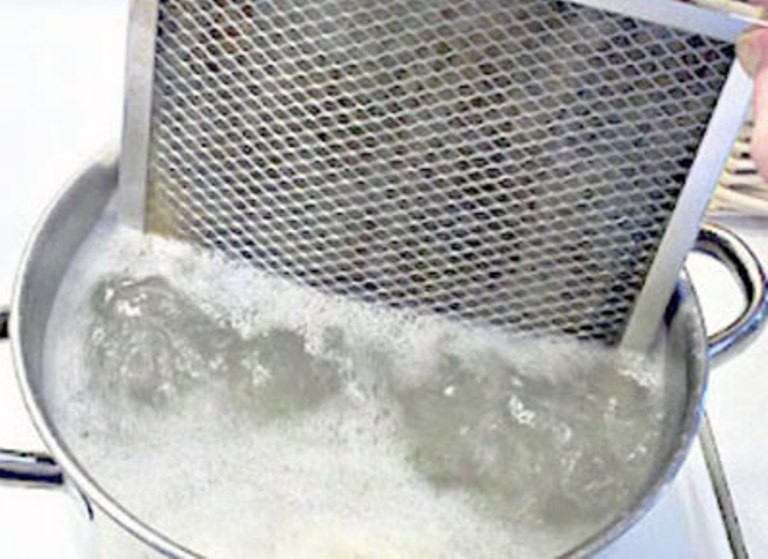 - Immergi la griglia in acqua bollente, lascia cuocere a fuoco lento per circa 15 minuti. L'acqua diventerà gradualmente marrone. Successivamente, rimuovere immediatamente il contenitore dal fuoco. Se il grasso non si dissolve completamente, è possibile ripetere la procedura di pulizia, ma già nel liquido aggiornato.