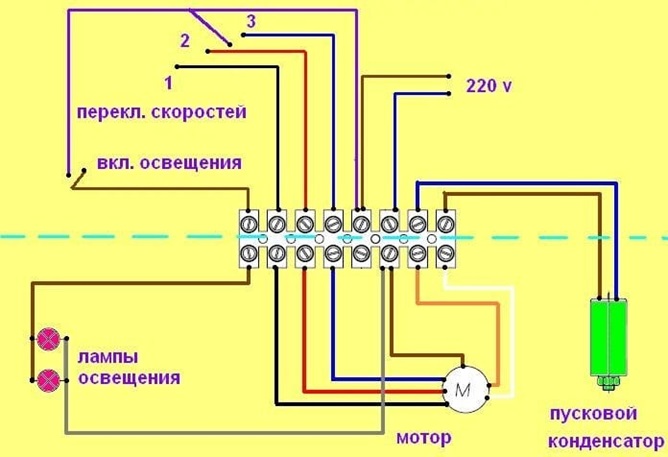 - schema di commutazione della velocità - in varie modifiche delle cappe da cucina, viene eseguito utilizzando elementi come un interruttore, un regolatore di tensione, un dimmer, dispositivi portatili (interruttori, pulsanti, interruttori a levetta).