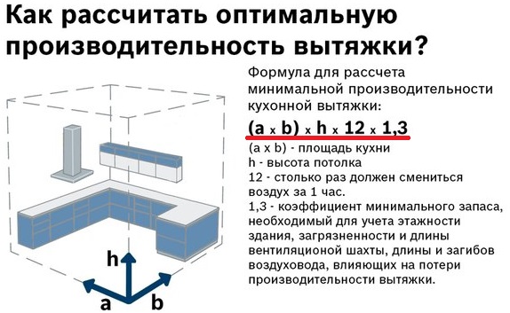 Tutti i parametri di cui sopra si intersecano tra loro e viene utilizzata una semplice formula per calcolarli: l'altezza e l'area della cucina vengono moltiplicate per 12. Le norme indicano che è in questa quantità che l'aria deve essere completamente aggiornata mentre la cucina sta preparando il cibo.
