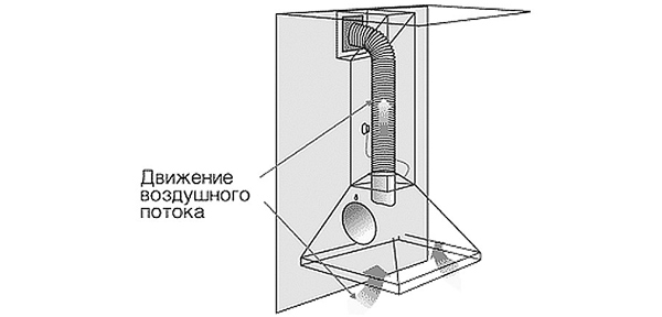 - La presenza di un gran numero di curve nello spazio dalla cappa alla ventilazione complica il percorso del flusso d'aria. Per questo motivo, la sua velocità aumenta, il che porta a un forte rumore.