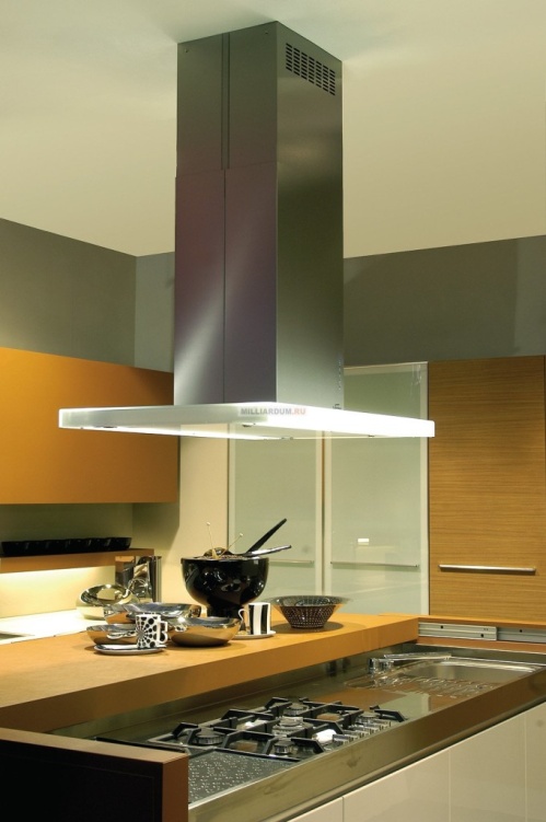 - Isola. L'installazione viene eseguita al soffitto sopra il piano cottura, se si esclude la possibilità di montaggio a parete o pensile. Questo è di solito praticato in un monolocale.