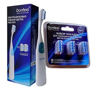 Donfeel HSD-005. Un dispositivo ad ultrasuoni che funziona a una frequenza di 1,7 MHz. Alimentato da batterie a dito. È prodotto in Cina o Taiwan. Tre ugelli sostituibili sono inclusi con il dispositivo. È possibile passare dalla modalità standard a quella delicata. Il costo approssimativo è di 2800 rubli.
