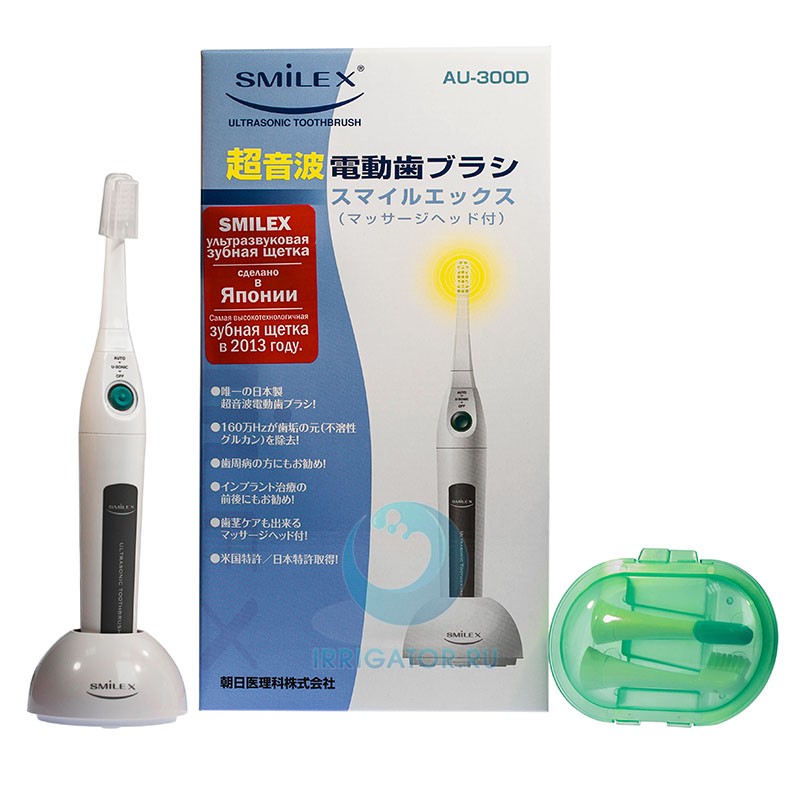 Asahi Irica AU300D. Uno strumento moderno e conveniente per la cura della cavità orale. Ha tre modalità operative: standard, delicata modalità spazzolino e modalità massaggio. È fatto in Giappone. Tre ugelli intercambiabili sono forniti con il dispositivo. Alimentato a batteria. Il costo è di circa 10.000 rubli.