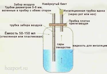 Prima dell'uso, assicurarsi che l'inalatore sia ben stretto. Per verificare ciò, è necessario coprire il tubo con la mano e soffiarlo nella bottiglia. Se l'aria non va, allora tutto è fatto correttamente. Se il dispositivo passa aria da qualche parte, è necessario sigillarlo con nastro adesivo, plastilina o qualsiasi altro metodo adatto. Tutto, il dispositivo è pronto per l'uso. Per inalazione, è necessario versare acqua riscaldata nella padella, inserire un inalatore improvvisato, versare la soluzione farmacologica attraverso la bottiglia e metterla a fuoco fino a quando non inizia a formarsi il vapore, che deve essere respirato.