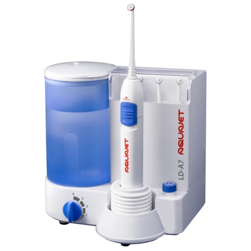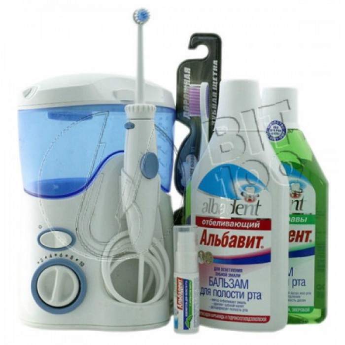 Irrigatore compatto a impulsi, in grado di funzionare ininterrottamente per 20 minuti. Il kit include un ugello standard e il dispositivo stesso è alimentato da batterie a dito. Durante la pulizia, è possibile attivare due modalità di pressione di un flusso di acqua: morbida e normale.