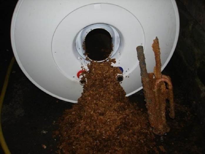 In ogni acqua c'è una certa quantità di sali e minerali disciolti. Con frequenti riscaldamento e raffreddamento, questi sali si cristallizzano e si depositano sulle pareti interne del serbatoio nella sua parte inferiore. Per 2-3 anni, non solo le pareti sono coperte con un guscio resistente, ma anche un elemento riscaldante e un tubo di rame, all'interno del quale è inserito un sensore di temperatura. Per ridurre la rigidità delle scorie formate e prevenire la corrosione del corpo del serbatoio, un anodo di magnesio è montato sulla stessa flangia con un elemento riscaldante. Ma non è progettato per un lungo lavoro, quindi deve essere cambiato di volta in volta.