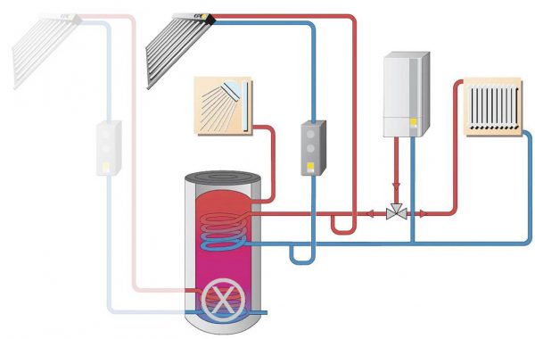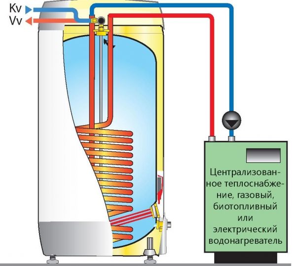 Il serbatoio di riscaldamento è efficace non solo nella stagione di riscaldamento. Tale progetto può mantenere l'acqua calda non solo in un'unità separata, ma anche come fonte principale di approvvigionamento di acqua calda. Per questo, è necessario che la bobina sia riscaldata direttamente dall'apparecchiatura della caldaia. È particolarmente conveniente utilizzare un tale schema in case private e cottage in cui sono installate caldaie a combustibile solido e gas.