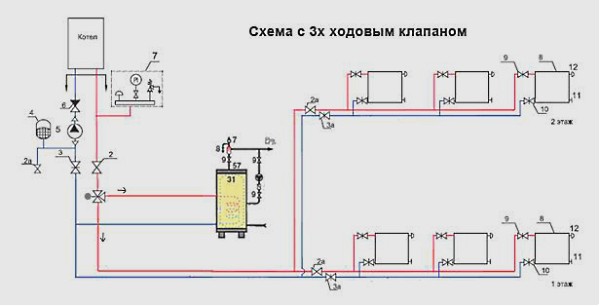 Quando si installano sistemi di avvolgimento indiretto con valvole a tre vie, è necessario tenere presente che questo metodo è destinato a serbatoi con spostamento maggiore. Sviluppando un tale sistema, viene calcolato come verrà eseguita l'installazione di un tipo di riscaldamento a doppio circuito.