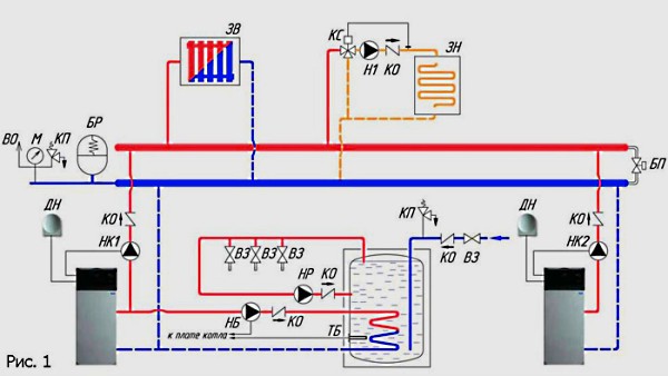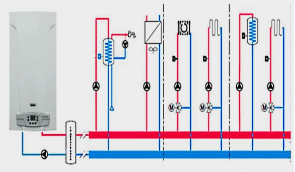 - Installazione di 2 pompe di circolazione per 1 sistema. Questo tipo di circuito consente di distribuire l'acqua in ingresso nel flusso per riscaldare e riscaldare direttamente il liquido nel serbatoio. Le caldaie di questo tipo hanno termostati integrati e interruttori automatici di direzione del flusso.