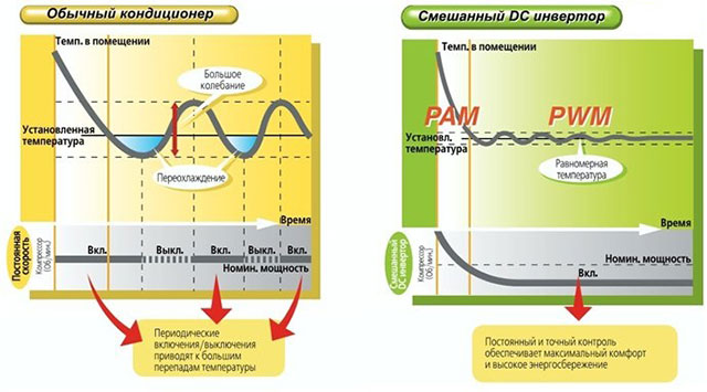 Per molti parametri indicati nel confronto delle caratteristiche distintive del lavoro, l'inverter mostra risultati migliori di un semplice condizionatore d'aria. L'elevato costo giustifica i costi che superano del 40% il prezzo di un normale dispositivo, durata e risparmi sul pagamento dell'elettricità.