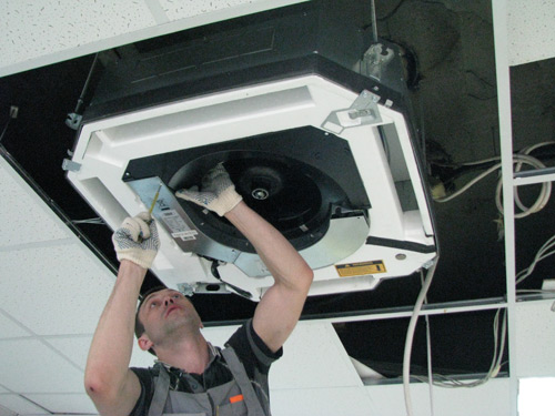 Lavori di installazione sull'installazione del condizionatore a cassetta dell'unità interna