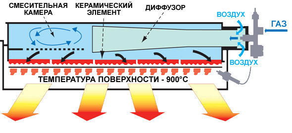 Tali dispositivi hanno una presa speciale per il collegamento di valvole del gas. Come fonte di energia è una bombola di gas. All'interno della struttura, il gas viene bruciato. Nonostante ciò, non c'è fiamma aperta durante la combustione, che garantisce un funzionamento sicuro.Alcuni modelli possono riscaldare fino a 800-900 gradi Celsius.