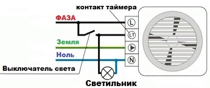 Se la ventola ha un timer, funziona secondo un principio diverso: l'illuminazione è accesa con la ventola. Dopo aver spento la luce, il dispositivo continua a funzionare per un certo tempo. Schema ed esempio di collegamento di una ventola di scarico con un timer nella figura seguente.