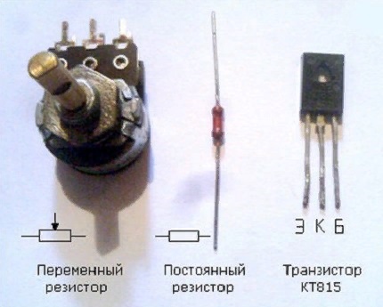 La base T è saldata al contatto medio del PR, il collettore all'uscita laterale. Un resistore con una resistenza di 1000 Ohm deve essere collegato al bordo opposto del PR. La seconda uscita P è saldata all'emettitore T.