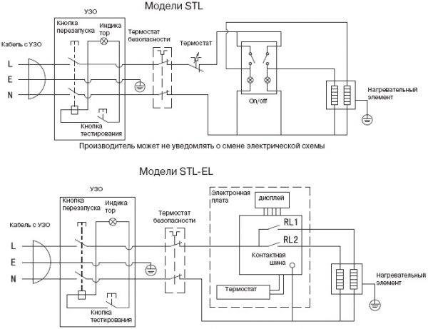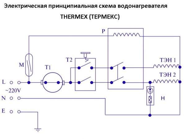 Sopra sono schemi di dispositivi di diversi modelli di scaldacqua istantanei. Come puoi vedere, in questi scaldabagni ci sono elementi riscaldanti a cui la corrente elettrica passa attraverso il relè di controllo della temperatura, il pressostato e l'interruttore. Entrambi i relè nel circuito svolgono una funzione di protezione e scollegano la rete se i parametri non sono corretti. L'interruttore viene utilizzato per regolare la potenza operativa del dispositivo.